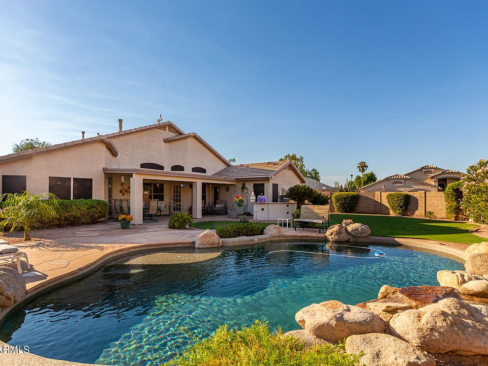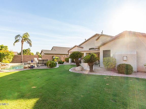 Welcome to the popular Kempton Crossing neighborhood nestled in the heart of the east valley, This subdivision is a very rare exclusively single level home subdivision. Original home owners have meticulously cared for and upgraded this beautiful ranch style home with 3 car garage and oversized corner lot. 4 bedroom split floor plan featuring a large open kitchen with oversized island, huge eat in dining room for hosting, track lighting, built in double wall ovens, RO system, walk in pantry, fireplaces in both the great room and dining room, built in ceiling speakers and volume control in all rooms and patio. Large garage has epoxy floors, storage cabinets, and rough in for service sink. The backyard is an entertainer's dream highlighting a private pebbletec pool w/ variable speed pump, water feature, built-in gas Viking grill, extended covered flagstone patio, manicured landscape, large grass area and irrigation system with new valves and timers. This home is a unique gem centrally located on the Gilbert/Chandler border close to the 202, schools, hospitals and shopping and is looking for its new owner.