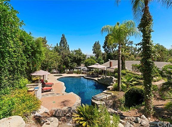 Unbelievable SINGLE STORY resort-like refuge with the character and charm Old Bridge is known for! Well known on the CHOC home tour for its expansive lot and famous cave grotto. It will be all your friends talk about with entertainment bar, plexi glass pool viewing window and spa. Every day feels like vacation with waterfalls, fountains, custom rock scape and fully gated large black bottom lagoon pool. Entertaining is easy with built-in BBQ center, circular island bar, expansive grass area and huge covered patio. Step into the incredible ambiance of this home & leave all your troubles behind with the comfort and ease that permeates throughout. Decorated with a tasteful eclectic twist: hardwood floors, vaulted wood ceilings, bay picture window and large herringbone fireplace create the always popular timeless look. The updated white traditional kitchen with sleek granite tops, stainless appliances and casual dining niche offers views of the yard. Dinner parties welcomed with large formal dining, grid pattern French windows and large open living room perfect for the holidays. The family room is warmed by a chic fireplace, coffee bar and French doors leading out back. The generous master suite has French doors, inviting remodeled bath with dual vanities, additional storage, oversized shower and sumptuous spa tub. Three additional bedrooms, updated full bath with dual vanity, plus laundry complete the spacious floorplan. Three-car garage, pristine condition and great schools!