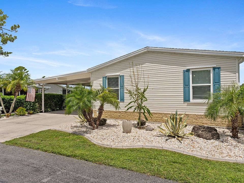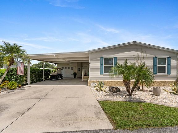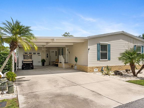 FOR SALE - 2003 Palm Harbor Home - 3 bedroom, 2 bath with Florida room. Home is being sold PARTIALLY TURNKEY - all appliances will stay - INCLUDES GOLF CART Beautiful 2003 Palm Harbor doublewide manufactured home on the water in the lovely boutique community of Village at Riverwalk selling with all appliances and some furniture included. This 3 bedroom, 2 bathroom split plan with vaulted ceilings, tray ceiling in the living room, is spacious and attractive. The large eat-in kitchen with all new appliances and new cabinets is a great feature for anyone who enjoys cooking and entertaining, while the Florida room provides additional space for relaxation and outdoor living and has a gorgeous view of the large pond. The inside laundry is a convenient feature that many homeowners appreciate, and the huge master bath is a plus. The double wide carport provides additional space for storage and parking and the garage will fit a golf cart or small car, golf cart is included. A/C replaced in 2018, roof replaced in 2018.. The home is in one of the hottest real estate locations in the entire United States. The spring training homes of both the Atlanta Braves & Tampa Bay Rays are just minutes away. The world-renowned Gulf of Mexico beaches are all within 30 minutes or less. The Village at Riverwalk offers a lifestyle that every retiree dreams of. Village at Riverwalk is a 55+ community nestled among pines and palms near North Port Florida. This truly is The Village That Nature Built! The Village at Riverwalk offers its residents many community amenities including a heated pool, clubhouse, fishing dock, canoe/kayak launch, fitness center, tennis/pickle ball courts, library, shuffleboard and nature trail. We are also a pet friendly community, allowing two pets up to 50 pounds each. Monthly fee which includes mowing, trash pickup, basic cable and all amenities is only $225 per month. This lovely home has been priced to sell so come enjoy our beautiful Florida weather - minutes away from beautiful