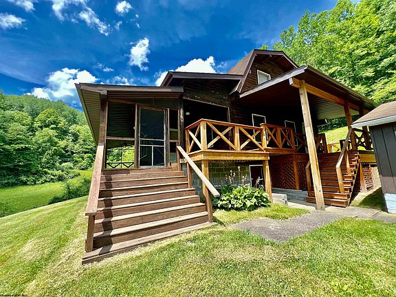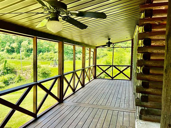 Enjoy the sunset from your large covered front deck! This exceptional 3BR/2BA log home sits on 91 acres at the very end of the hollow for complete privacy.  This perfect location provides serenity, privacy and the beauty of nature!  Lots of deer and other wildlife roam the property. Primary bedroom and bath on the first floor.  House has two furnaces - one gas, one electric, plus a whole house generator. Gas stove in living room with stone wall backdrop. Wood stove in basement. Laundry and 2nd bathroom are in the basement. Basement has been partially finished and could add extra living square footage. Well water with a Culligan water treatment system. Private septic. Free gas, detached 2 car garage, additional storage garage and 650 sq. ft. older barn round out the amenities!