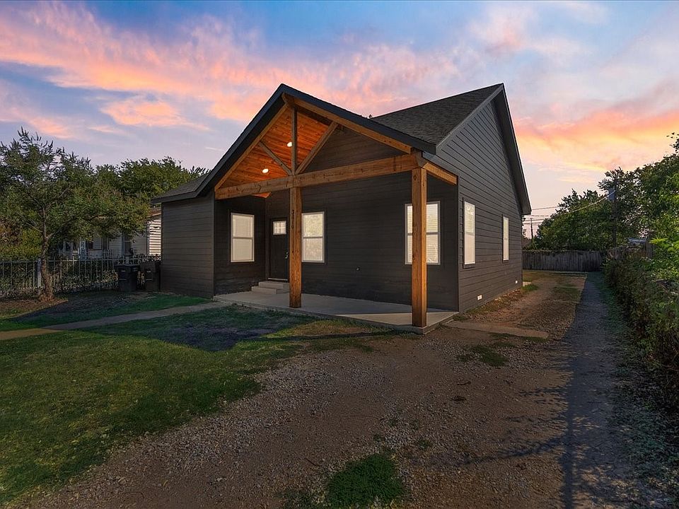 A truly move-in-ready new build with modern charm and exceptional quality! This brand new 4-bedroom, 2-bathroom modern craftsman home, completed in September 2025, offers 1,374 sq ft of open-concept living with a perfect balance of style, efficiency, and comfort. The exterior makes a bold impression with dark siding accented with natural cedar gable and post beams, and a large covered front porch featuring a cedar tongue-and-groove ceiling with recessed lighting. Inside, you’ll find gray-toned walls, gray and brown luxury vinyl plank floors, recessed lighting, modern ceiling fans, and wood faux blinds throughout. The spacious kitchen showcases modern shaker-style gray cabinets with hardware, white quartz countertops with soft gray veining, and an undermount full-basin stainless steel sink with a sleek modern faucet. Both bathrooms feature walk-in showers with floor-to-ceiling tile in a vertical offset pattern for a clean, high-end finish. Designed for incredible energy efficiency, the home boasts fully spray foam insulation in the walls, attic, and crawl space. Enjoy the large backyard and side covered patio with extended concrete and a walkway leading to the outdoor area—perfect for entertaining or relaxing. Ideally located just 5 minutes from the Fort Worth Stockyards, 11 minutes from Downtown Fort Worth, and minutes from I-35W and 820-183, this new build delivers modern craftsmanship, energy-efficient living, and unbeatable convenience.