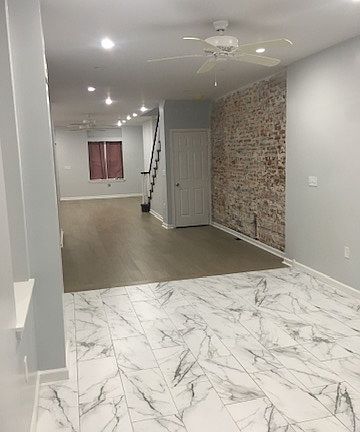 Exposed brick, recessed lights, hardwood-style floors