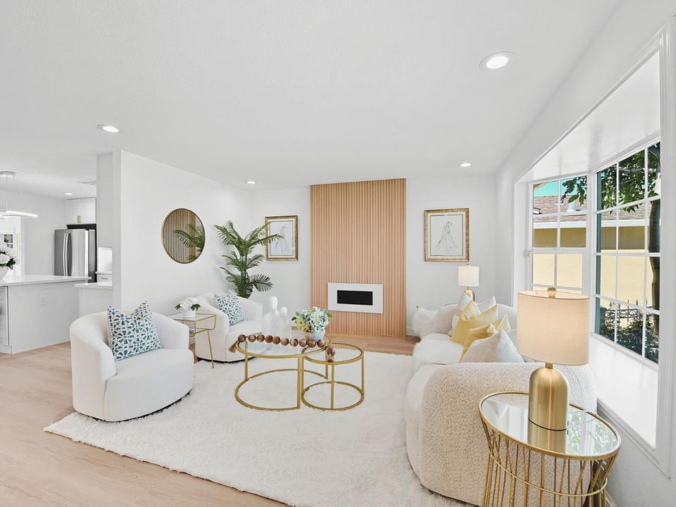 Contemporary electric fireplaceNew water heaterModern cabinetsSleek white pendant lightsOpen-concept layoutNew flooringBrand-new roof