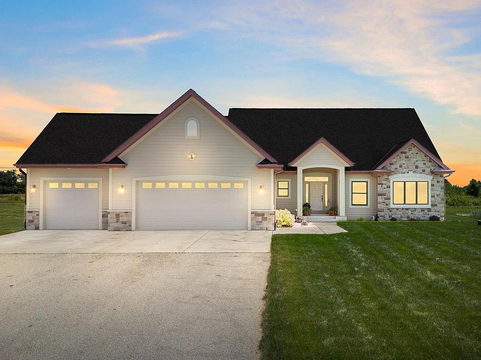 Discover the epitome of country living in this stunning custom ranch, perfectly situated on 8 scenic acres. This 4-bedroom, 3.5-bath home is designed to impress, offering tall ceilings and expansive windows that invite the beauty of the countryside into every room.The walkout basement is an entertainer's dream, featuring a soundproofed bedroom tailored for gaming, a cozy media room for movie nights, and a full kitchen, ideal for gatherings and extended stays. Walk-out to outdoor living space featuring custom patio with a wood-fired pizza oven and a live-edge fireplace, creating a perfect setting for entertaining. Heated pole barn is equipped with water and includes a private office complete with fireplace. Walking trails wind through the property, offering endless enjoyment of nature.