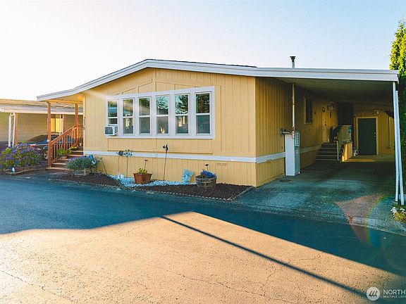 Find comfort and convenience in this cozy manufactured home located in 55+ River Estates community! Featuring 3 bedrooms and 2 bathrooms, this home offers just the right amount of space for relaxed living. The open concept layout with vaulted ceilings connects the kitchen, complete with breakfast bar, to the living room, creating a functional and inviting space. Outside, a modest patio provides a space for quiet moments or casual get-togethers. Ample added storage shed with power and covered parking with electrical vehicle charging port. This home also benefits from having ample guest parking, activity clubhouse, pool & hot tub, BBQ, RV parking, dog run, hiking trails, and community ponds.