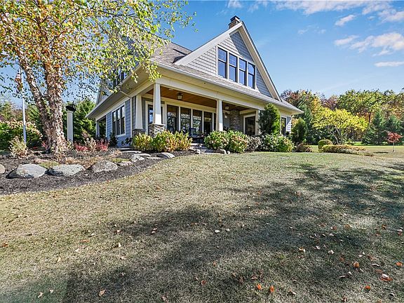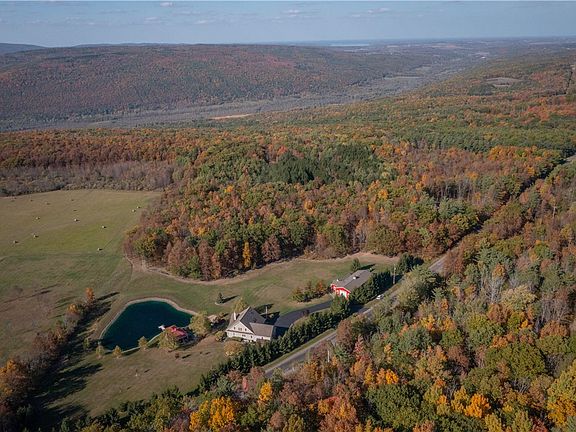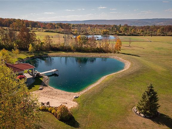 Experience timeless craftsmanship and modern luxury in this extraordinary custom-built 3 bedroom, 2 full bath country estate, nestled on top of 20 picturesque acres of rolling countryside, with views that stretch all the way to Bristol Mountain! Every inch of this home was handcrafted and thoughtfully designed by the owners, blending rustic charm with refined elegance. Step inside to discover a soaring floor to ceiling stone fireplace, tray ceiling, custom built cabinetry throughout, and expansive living spaces ideal for entertaining or relaxing in comfort. Wrapped in windows, the home is bright and cheery and you can enjoy the view from every room! The gourmet kitchen features stunning granite counters, commercial-grade top-of-the-line appliances, perfect for both family meals & grand gatherings. Gorgeous hardwood floors throughout. Walk-in pantry with first floor laundry. Small office nook off of kitchen. First floor Primary bedroom with custom built-in closets and tiled primary bath. A lovely winding staircase leads upstairs where you will find 2 additional bedrooms, and a cozy family room with piano and a spa like bathroom complete with Aquatic airbath tub. Outdoors, a private swimming pond w/ sand beach, dock & enclosed entertainment pavilion creates a resort-like oasis right at home. Enjoy serene evenings by the water, host unforgettable parties, or simply unwind in natures embrace. A large finished outbuilding offers multiple storage bays and a "man cave" fit for a king, ideal for entertaining weekend guests, with walk-out covered porch for enjoying the views! Take a stroll and explore the woods and enjoy the wildlife. Multiple groomed trails throughout the wooded acreage invite you to take a stroll and explore the woods and enjoy the abundance of wildlife! This Finger Lakes estate combines the best of luxury, privacy and craftsmanship- a rare find for those seeking a private retreat without compromising on comfort or timeless style.