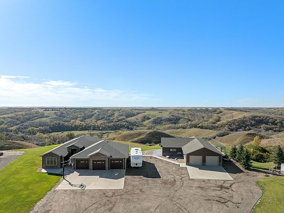 Stunning ranch-style home on a 2-acre lot with a separate mother-in-law suite and panoramic views. This absolutely incredible ranch-style home includes a 2-acre lot with a separate mother-in-law suite and one of the most beautiful views around. And only a short drive from Minot. The home features 2022 sq ft with 3 bedrooms and 2 bathrooms, a gourmet kitchen with inviting design and pantry. Sliding doors open to the patio, offering sweeping views and a path to a cozy firepit area, making entertaining and daily living a joy. The large 1570 sq ft attached garage is ideal for multiple vehicles or a workshop, with epoxy flooring, in-floor heat, and floor drains for practical, all-season use. The separate mother-in-law suite, built in 2015, includes 1240 sq ft of living space with its own living room, kitchen, and bathroom, plus a relaxing hot tub room and an area dedicated to dogs with a 14x7 fenced outdoor space. An attached garage adds convenience and extra storage. The property offers outdoor space designed for enjoying the view and entertaining, a quiet rural setting with the convenience of proximity to Minot, and well-maintained modern amenities. This property is truly a standout—whether you’re seeking a spacious family home with a separate living area for guests or in-laws, impressive shop space, and a serene backdrop, you’ve found it here.