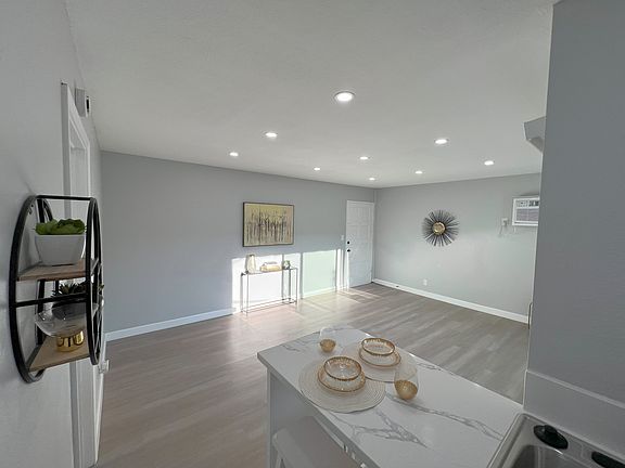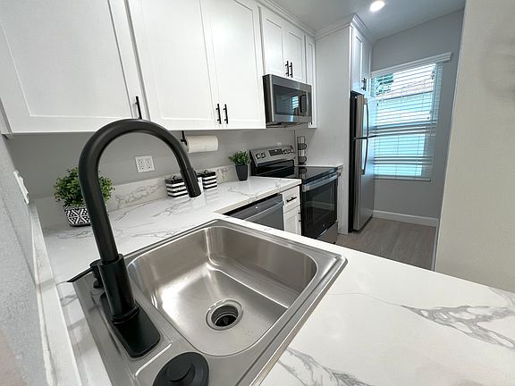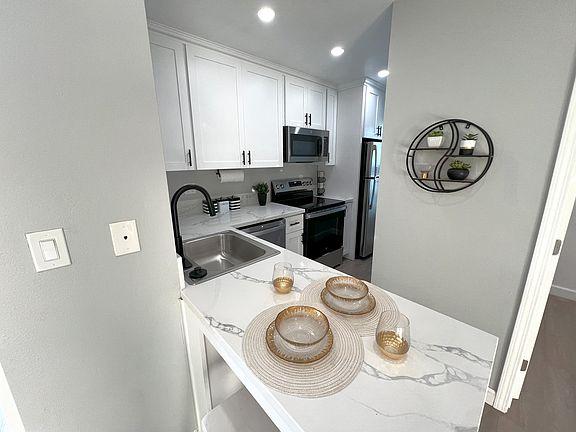 Welcome to Estrellita, a professionally managed and well maintained 20-unit apartment property located in the heart of Los Alamitos. We feature studio, one- and two-bedroom floor plans consisting of 600 to 1,000 square feet. These apartments boast a modern design with freshly painted two-tone color scheme, all new windows and blinds, new shaker cabinets, new interior doors, new quartz countertops and new hard surface flooring and baseboards throughout. The units are cooled by air conditioning and hard-wired ceiling fans in the bedrooms and dining room. The living room and kitchen are illuminated by new recessed lighting, creating a warm and inviting atmosphere. The kitchens are equipped with new stainless-steel appliances and a large sink with a garbage disposal. Our studios feature a two-person bar nook, perfect for casual dining and has a patio off the living room, offering a private outdoor space. Selected one and two bedrooms feature enhanced kitchens with a stove top island with seating, perfect for casual dining or entertaining. Bedrooms have large walk-in closets with a closet door, providing ample storage space. The bathroom is updated with new light fixtures and accessories.