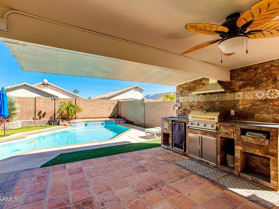 Pride of ownership! This 3 bedroom, 2 bathroom home has a new AC (Trane) and new roof underlayment that was installed in 2022. The kitchen remodel (2023) features new appliances, custom shelves, sliding drawers, enhanced storage options, crown molding and recessed/under cabinet lighting. Both bathrooms have been remodeled with the master showcasing a custom, curb-less, Schluter shower system. New tiling in the bedrooms and tile throughout the rest of the home. Step outside and there is an oversized covered patio with a built-in kitchen, misters, pool, hot tub, artificial grass and putting green in the backyard for year-round entertaining. For added efficiency the homeowner added 4 inches of blown-in insulation above the home and in the garage. Prime location located near the new Taiwan Semiconductor Plant, shopping, dining, and easy freeway access to I17 and 101.