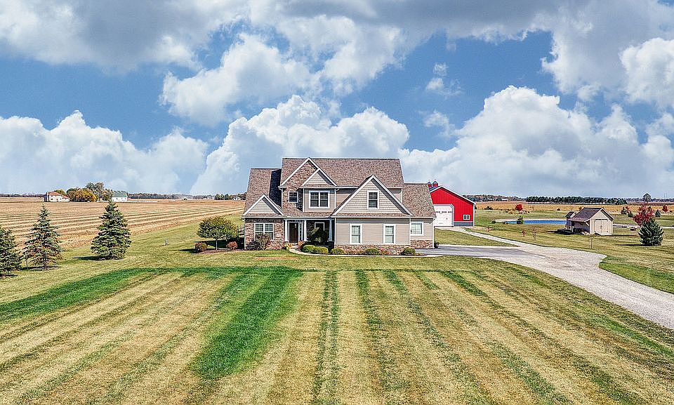 Sitting on over 5 acres, this property has a lot to offer From the moment you enter through the front door, you're met with beautiful hard wood floors and ample natural light. The spacious family room is open to your bright eatin kitchen with granite counters and large island. Very nice master suite w ensuite on the main floor. Custom tile shower and walk in closet, with 4 additional bedrooms upstairs. Covered patio off the back for you to enjoy the amazing view. Plenty of storage space with full basement & pole barn. Enjoy the pond during the summer months. This one is a 10