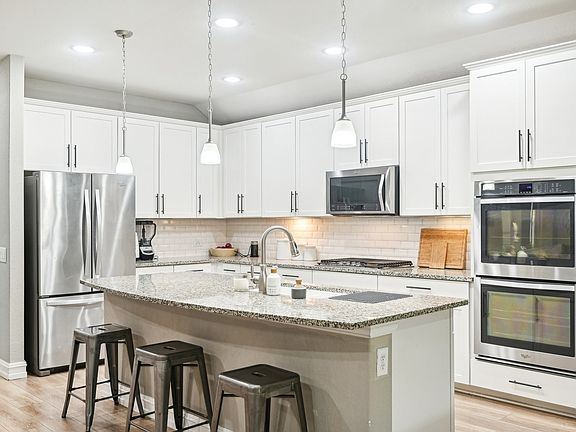 The heart of the home is the open-concept living area, filled with natural light from a stunning wall of windows. The kitchen is a chef’s dream, featuring granite countertops, double ovens, a walk-in pantry, and an abundance of upper and lower cabinets for all your storage needs.