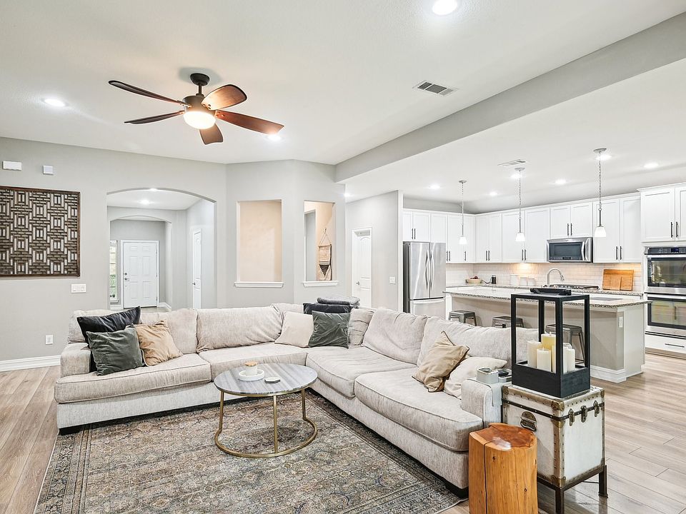 Enjoy outdoor living with a large covered front porch and private fenced backyard EXTENDED patio—perfect for relaxing or entertaining. Inside, you'll find generous closet space throughout, an oversized garage, and a laundry room with utility sink for added convenience.