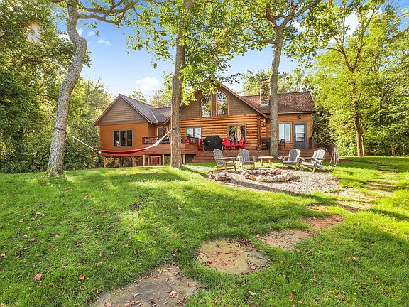 Welcome to Norway Lake! This beautiful log home is tucked into the woods on over 2 acres with 200+ feet of lakeshore. Warm and welcoming, yet finished with timeless details, the home features a lakeside primary suite, two guest bedrooms, and a fun loft with built-in bunks for extra sleeping space. Fantastic views of the lake can be enjoyed from the kitchen, dining, living, and sun rooms, all anchored by a stunning stone wood-burning fireplace. Step outside to appreciate the lake for all of your favorite water activities, the privacy of the wooded setting, and the wonderful landscaping. The insulated garage also offers the opportunity to finish a game room or rec space. Selling fully furnished (with only a few personal items excluded), this property is a true turnkey retreat — tranquil, private, and ready to enjoy!