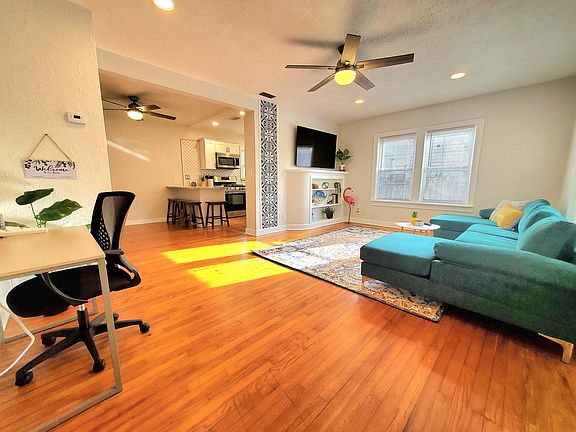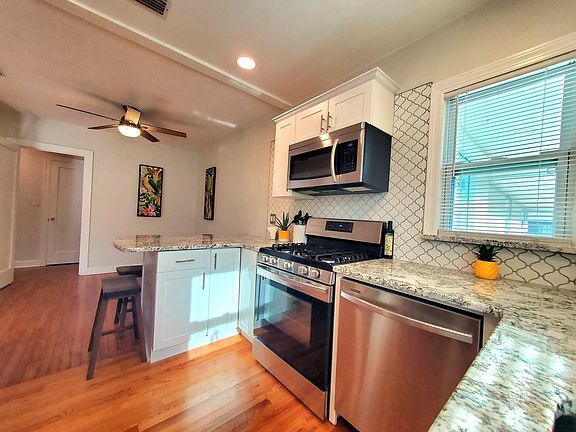 This house features new Central Air conditioning, fresh light paint, newly refinished original hardwood flooring, big kitchen with island seating for 4, all new stainless appliances (including natural GAS cooking range, dishwasher, and French door fridge), new kitchen cabinets with quiet close, granite counter tops, deep over-sized kitchen sink, lots of natural light, all new recessed lighting throughout, newer energy efficient windows, new ceiling fans with remote control, and new blinds on every window. A large living room with stylish and comfy velvet couch and a desk and rolling chair for a dedicated workspace.