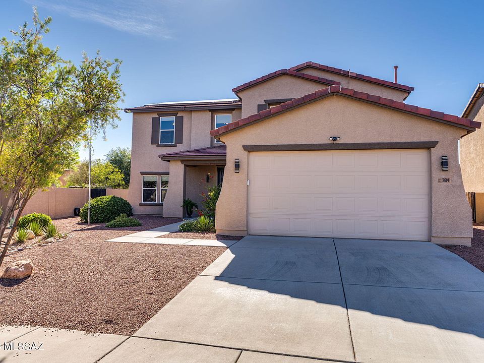 Discover this spacious and well-maintained 4-bedroom, 3-bathroom contemporarytwo-story home in the tranquil Black Horse subdivision of Tucson. Enjoy scenicmountain views and family-friendly amenities in a peaceful setting.The beautifully appointed kitchen features Zodiac quartz countertops, rich cherry cabinetrywith crown molding, stainless steel appliances, and generous cabinet and counter space.An open-concept layout flows seamlessly into the great room with fireplace, dining area,and game room--ideal for both everyday living and entertaining.Upstairs, the primary suite offers a large walk-in closet, dual sinks, soaking tub, and aseparate shower. A spacious loft adds flexibility for a home office, media room, or playarea.Step outside to a professionally landscaped backyard with stunning mountain views, a