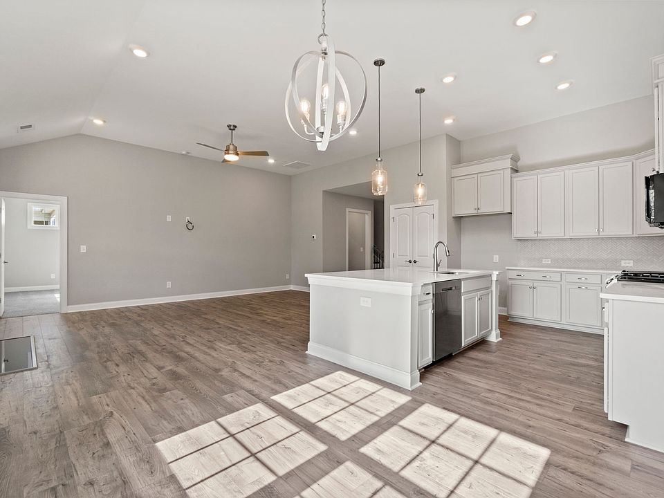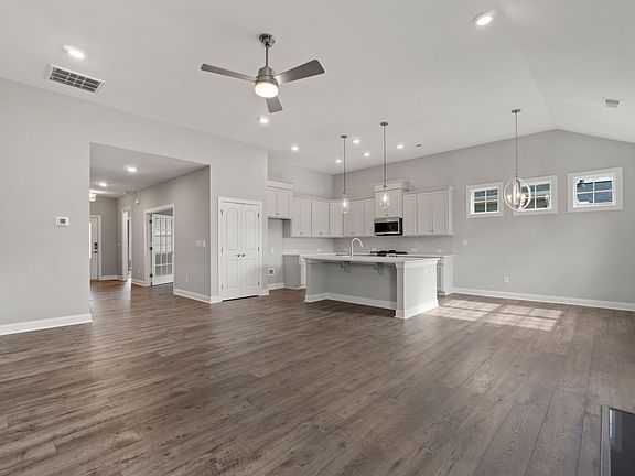 The inviting Stapleton single-family home offers main level living and a beautifully designed open floorplan tailored to your needs. Guests will find two cozy bedrooms sharing a bathroom at the front of the house, while down the hall lies an expansive kitchen with oversized island and a breakfast area, great for entertaining friends and loved ones alike! The main level primary suite featuring dual vanities, a large walk-in closet, and standing shower - providing all the necessary amenities. Design selections featured in this home include white kitchen cabinets, gas appliances, pendant lighting, Luna Pearl granite countertops and hardsurface flooring. *Photos are of a similar finished home.