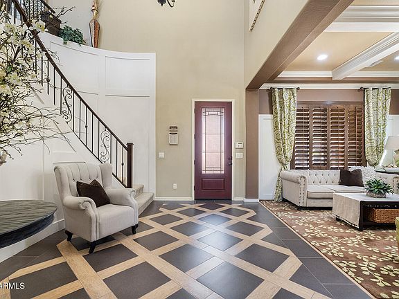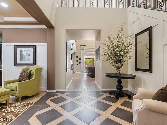 Exquisite Former Model Home with Mountain Views and 1/2 mile walk to Gilbert Regional Park! This breathtaking former model showcases exceptional design, luxury finishes, and stunning mountain views. The dramatic two-story foyer features custom tile flooring and a sweeping curved wrought-iron staircase. The gourmet kitchen is beautifully appointed with upgraded cabinetry, stainless steel appliances, a spacious walk-in pantry, and an expansive island that flows seamlessly into the great room.
