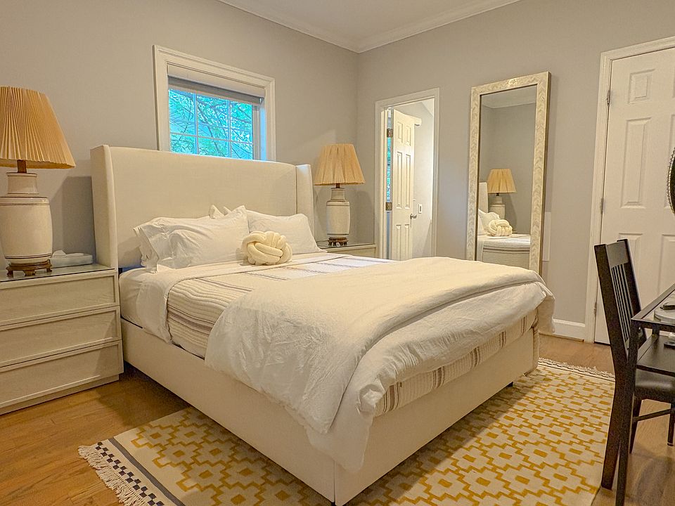 Bedroom 000 is a furnished main-level bedroom with a private in-suite bathroom. Features: a queen-sized premium Beautryrest bed, desk, night stands, walk-in closet with Elfa storage system, and a 43" Smart TV.