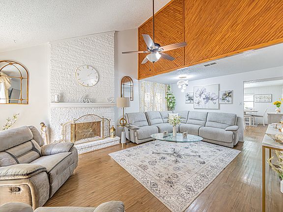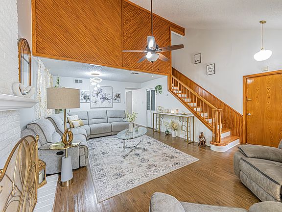Welcome to this inviting 2 story home with a functional layout and plenty of updates. As you enter, the open living room greets you with vaulted ceilings, fresh white paint and flooring throughout, and a cozy wood burning fireplace. Heading into the eat in kitchen, which offers granite countertops, an island, electric appliances, and room for a dining table. Just off the kitchen is the primary suite, complete with a walk in closet and space for a sitting area if desired. The remodeled ensuite bath features dual sinks, new countertops, fresh paint, and a walk in shower, plus an additional door to the hallway for guest access when needed. Upstairs, you’ll find two bedrooms with ceiling fans and a remodeled full bath with an updated sink and new counters. Step outside to enjoy a covered side patio and an inground pool with a diving board, perfect for the hot Texas summers. A small side yard provides room for pets, and the detached shed with electricity and a wall AC unit is currently being used as an office but could easily serve as a hobby room, workshop, gym, or guest space. Conveniently located near major highways, shopping, and entertainment, this home offers a great mix of comfort, flexibility, and fun.
