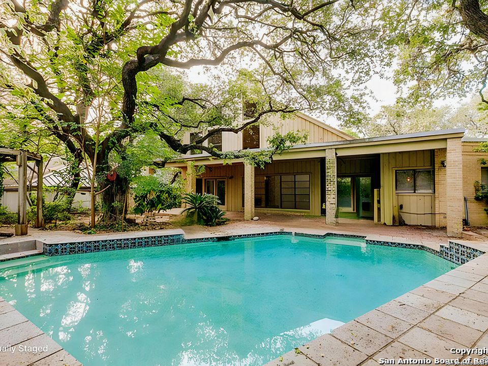 Welcome to 3615 Hunters Point, a one-of-a-kind architectural gem tucked beneath a canopy of mature oaks in the coveted Elm Creek community. This beautifully crafted home offers 4 bedrooms and 3.5 baths, along with generous living and entertaining spaces designed to embrace natural light and lush surroundings. Step inside to dramatic vaulted ceilings, expansive windows, warm natural textures, and unique character that you simply don't find in today's builds. The grand living room features soaring walls, a stunning floor-to-ceiling fireplace, and views that stretch out to the private backyard oasis. Multiple living and dining areas - including a family room, formal dining, breakfast room, and an upstairs loft space to create endless layout options for modern lifestyles, work-from-home needs, and comfortable hosting. The spacious kitchen offers abundant cabinetry, custom woodwork, and a breakfast bar overlooking the pool. The main-level primary suite provides quiet retreat with outdoor access, two walk-in closets, and spacious bath layout. Upstairs, two well-appointed bedrooms and a jack and jill bathroom offers privacy! Outdoors, the magic continues. Enjoy a peaceful, tree-lined setting with a sparkling pool, multiple patios, and natural landscaping that gives the feeling of a Hill Country hideaway - all while being just minutes from city conveniences. This home sits on a generous lot with side-entry garage and mature shade trees framing every view. Located in a prime central San Antonio location near the Medical Center, USAA, UTSA, top shopping and dining, and quick access to major highways. This is a rare opportunity to own a truly special property with timeless character, abundant space, and endless potential to make it your own. Homes like this do not come around often - experience the charm and possibilities of Hunters Point living.