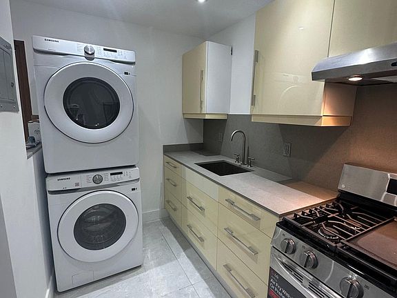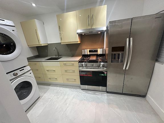 Brand new tile flooring throughout the entire unit. The kitchen boasts a brand new Samsung stackable washer & dryer, a double-door stainless steel refrigerator, and a stainless steel gas stove with built-in air fryer. The bedroom features a new AC mini split and a gorgeous light fixture. The living room has a ceiling fan, and the bathroom features a new vanity, light fixture, and an amazing square rain shower head.
