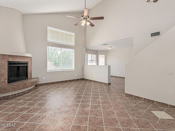 Crisp, light-filled two-story in convenient NW Tucson. A tiled front porch and easy-care desert landscaping welcome you to an airy great room with soaring ceilings, clerestory windows, and a stylish corner fireplace. The open kitchen offers abundant cabinet storage, wraparound counter space with breakfast bar, gas range, built-in microwave, and a window over the sink. Tile flooring extends through the main level for low-maintenance living. Sliding doors open to a private, block-walled backyard with covered patio--perfect for morning coffee or sunset BBQs. The bedroom suite features a dual-sink vanity and a walk-in shower; additional bedrooms are nicely sized for guests, office, or hobbies. Two-car garage and oversized driveway provide plenty of parking.