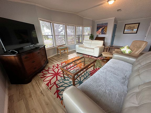 Active 55+ Community! Tucked away on a quiet street and surrounded by large, beautiful trees, this charming home offers an open floor plan filled with sunlight from expansive windows. Laminate flooring flows throughout, complemented by neutral, calming paint tones. The airy, cozy lanai invites relaxation, while the bay window in the living room adds character and light. The kitchen features ample cabinets and counter space, perfect for everyday living. Enjoy a spacious primary suite with a large ensuite bath and walk-in closets. A separate laundry room includes cabinets and a built-in desk area for added functionality. A peaceful retreat that feels like home the moment you walk in. Fully furnished!