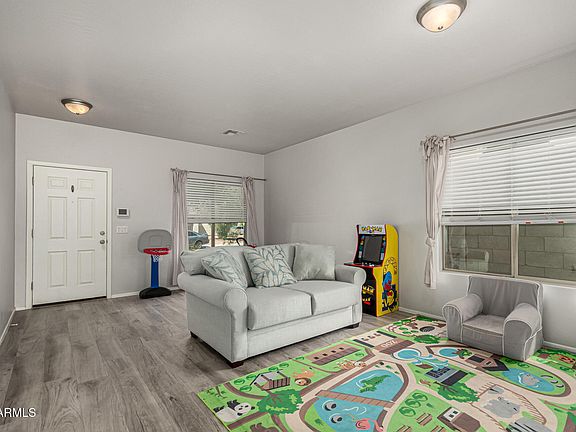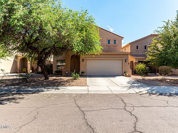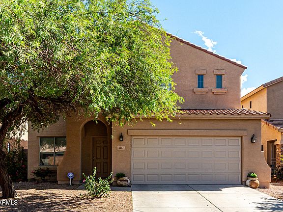 Check out this 4 bed, 2.5 bath home with a backyard you'll go crazy for! Great floor plan with 1 bedroom down and 3 bedrooms + loft upstairs. Wood look plank tile throughout main areas of the home. Upgraded carpet throughout the rest of the home that is less than 1 year old. Updated kitchen boasts white cabinets, granite counters, stainless steel appliances and a large pantry. The backyard features mountain views, a stunning self-cleaning PebbleTec pool with attached spa and turf! The perfect low maintenance AZ backyard! More recent upgrades include new insulated garage door in 2023, indoor/outdoor lighting updated, and shade screens. Don't miss this one!