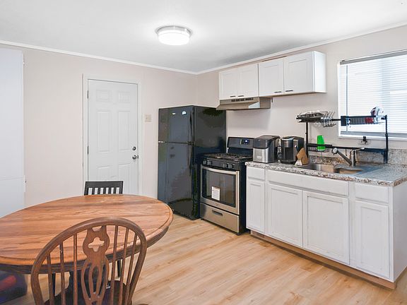 Open floor plan, shared laundry, large storage shed, large yard, covered patio, bedroom with French doors. Full-sized kitchen with gas range and refrigerator included. Full bathroom with shower and tub. Rent includes a landscaper and quarterly pest service. Central location.