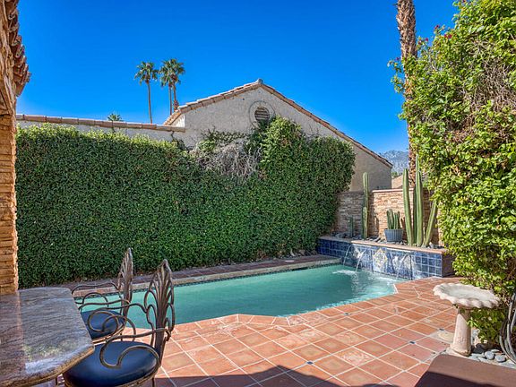 Gorgeous Las Casitas single story townhome with PRIVATE POOL AND SPA in gated Rio Del Sol! This unit features no shared walls, as well as a spacious floor plan with beautiful vaulted beamed ceilings, tile flooring, and arched doorways throughout. The living room showcases a fireplace and a glass slider to the backyard. The dining area has a modern hanging chandelier and french doors to the courtyard. The kitchen offers granite countertops, dark wood cabinetry, and stainless steel appliances. Both bedrooms a bathroom as well as the outdoors. Enjoy the private courtyard with in-ground pool and spa - this is the perfect space for entertaining guests! Residents also get to enjoy community pools, tennis courts, pickleball courts, dog park, and a lake to stroll around. Conveniently located near shopping, dining, Golf Courses and more! Step into a home that's ready to be loved--where new memories await for years to come.
