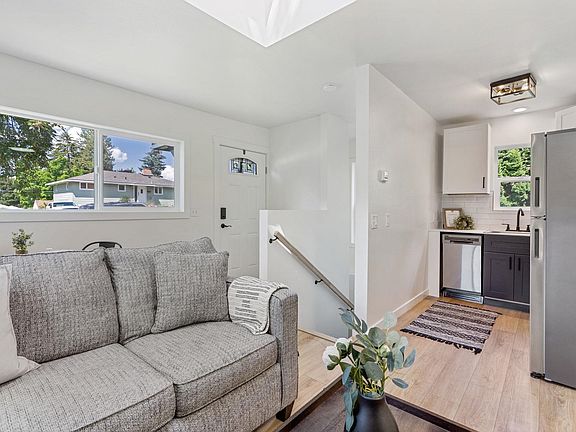 This completely remodeled, darling 2bed/1.5bath home is ready for you! Upon entry, the living/dining room offers a cozy fireplace with a large skylight, offering tons of natural lighting. Kitchen is fully equipped with brand new appliances, gorgeous countertops and white subway tile backsplash. Full guest bath on the main floor with beautiful large tile surround in tub/shower. Upstairs bedroom is nicely sized and has an adjacent closet. Just outside upstairs bedroom is access to oversized, fenced backyard and deck. Downstairs offers primary bedroom with attached 1/2 bath/ laundry room. Home has brand new siding, paint and finishings. Lot offers plenty of room for shop! Brand new sod in front yard finishes this beauty! Don't wait! This one is sure to go quick!