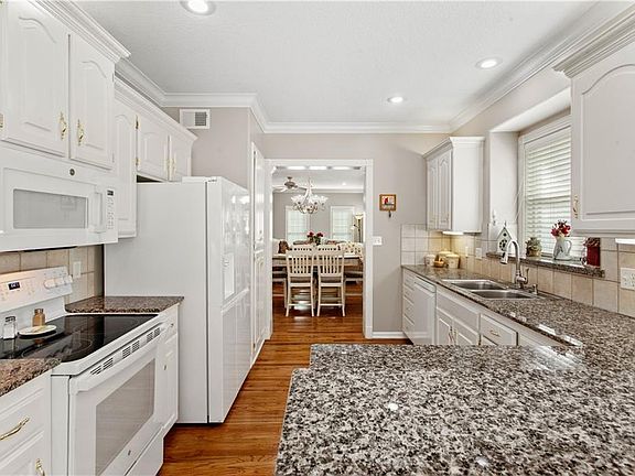 The kitchen offers granite counters, crisp, painted cabinetry, and opens to a cozy hearth room with gas fireplace overlooking the freshly refinished deck and treelined backyard. An additional oversized living room with space for dining makes entertaining easy. The master suite is a true retreat with gorgeous windows, double closets, dual vanities, jetted tub, and shower.
