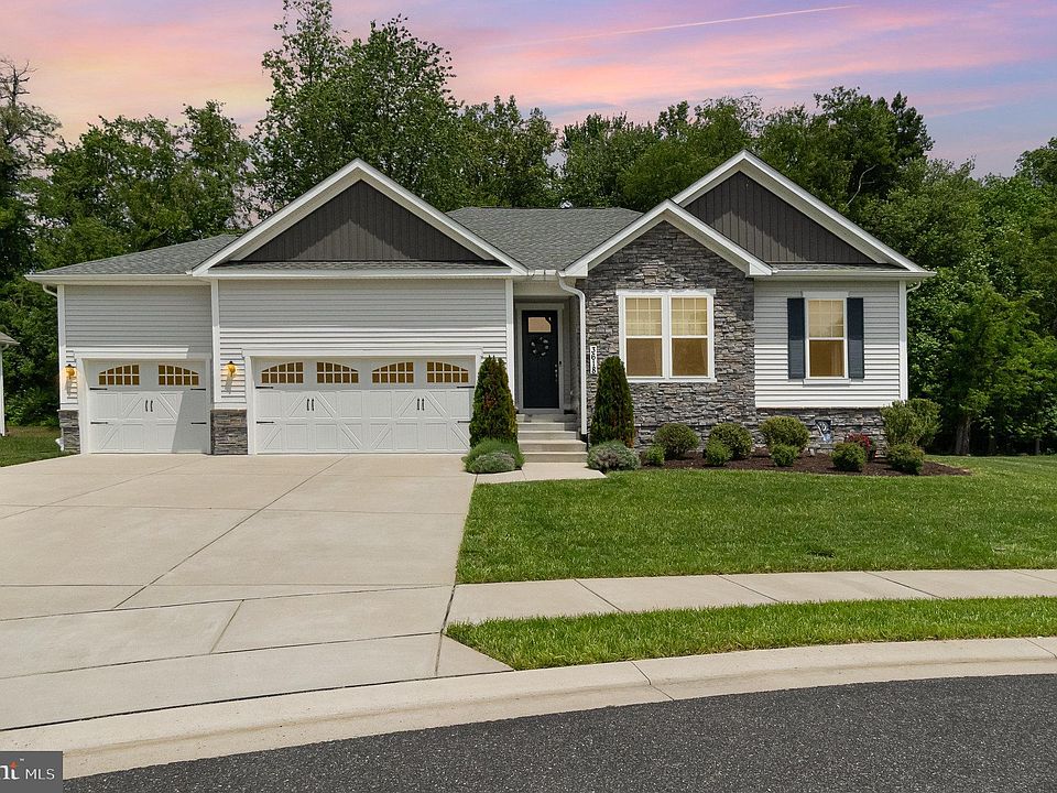Welcome to 3618 Sweet Allie Court. Over 3300 square feet finished. Pride in ownership is evident at every turn. Live the life of luxury. Located in beautiful Eagle's Rest, this well maintained home is loaded with builder upgrades and additional owner upgrades. Situated on a Cul de Sac setting that backs to woods. Beautiful and stylish stone and vinyl ranch with concrete driveway and 3 car garage. Architectural roof with gutter guards and buried downspout extensions with pop ups. Inside you are greeted by gorgeous luxury vinyl plank flooring and 8 ft doors with marble thresholds throughout the main level. The contemporary open floor plan features 9ft ceilings with recessed lighting, Extra large spacious island kitchen with quartz counters, soft close cabinetry and stainless steel double wall oven, refrigerator, dishwasher and gas range. Beautiful built in quartz desk, walk in pantry and mud room bench. Modern ceiling fans throughout. Large family room with stylish gas fireplace. Well lit vaulted dining area with a view of the rear yard adjoins a beautiful covered porch with remote controlled power screen for maximum comfort and enjoyment. The amazing primary suite has a spacious bedroom with walk in closets, stylish porcelain floor tile and a luxurious double size walk in porcelain tile shower. Additional bedroom and full bath, office or den and laundry on main level. The finished lower level has a walkout stairway, extra large recreation or home theater room. 3rd full bath and 3rd bedroom. Plus an additional storage area and exercise room. Don't miss the chance to make this beautiful ranch your home. Close to I-95, APG, MARC & AMTRAK, schools and shopping.