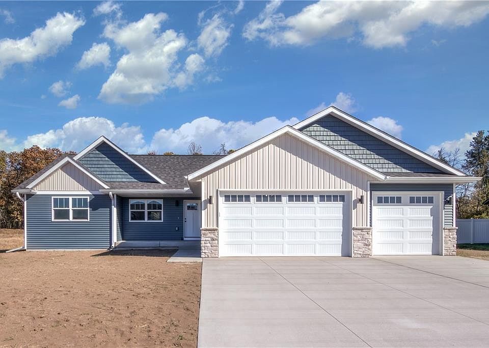 Quality Built by Chippewa Valley Contracting, LLC and MOVE IN READY! This thoughtfully designed home offers an open-concept layout with modern finishes and functionality throughout. The main floor features a spacious great room with vaulted ceilings?perfect for entertaining or everyday living?alongside a bright, well-appointed kitchen with upgraded solid surface countertops. Convenience is key with a dedicated laundry room that includes a half bath, a separate mudroom entry, and a private primary ensuite. Two additional bedrooms are connected by a Jack-and-Jill full bath, offering comfort and privacy. Large windows bring in plenty of natural light, and high-quality flooring and cabinetry add a touch of elegance throughout. The lower level includes approximately 400 sq ft of finished living space in a cozy family room, with the rest ready to customize to your needs. Additional highlights include: Fully insulated and sheetrocked 3-car garage with gas line installed for a future furnace 14x12 covered concrete patio for outdoor enjoyment Spacious 0.46-acre parcel, perfect for a future toy shed or additional outdoor living space Concrete driveway
