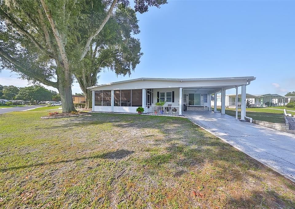 Escape the hustle and bustle for the tranquility of Shady Oaks and relaxed Florida living! Your low-maintenance and recently renovated dream home is here - this fully updated 2-bedroom, 2-bath doublewide manufactured residence on a highly desirable corner lot is waiting just for you. Located in a golf cart- and pet-friendly 55+ neighborhood convenient to US 301, you'll adore this welcoming community with walkable trails, stately shade trees, a vibrant and active clubhouse, shuffleboard, and a beautiful heated pool. Your enviable new abode boasts abundant curb appeal with a long driveway and wide carport, a membrane roof with a 15-year warranty, new windows/ sliders, storage AND utility rooms, a screened porch in the front of the house, and another patio area in the back, ideal for morning coffee or sunset drinks. Welcome guests into your cheerful and elegant home with new "Spill Repel" laminate flooring, charming architectural details, a spacious formal dining room with built-in storage, a formal living room, and a separate family room that's perfect for movie or game nights with your loved ones. The enormous kitchen features plenty of light, tons of counter and cabinet space, backsplash, and stainless steel appliances and fixtures. Both generous bedrooms are freshly painted with large windows and closets, and the attractive spare bath makes hosting friends and family a breeze. The owner's suite offers a relaxing oasis with an oversized master bath, double vanity, and mirrored closets. This adorable and move-in-ready home has far too many amenities to list here - see every lovely detail by scheduling your exclusive tour today!