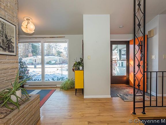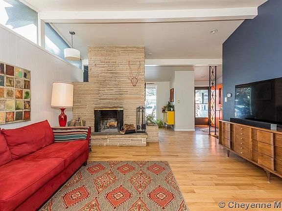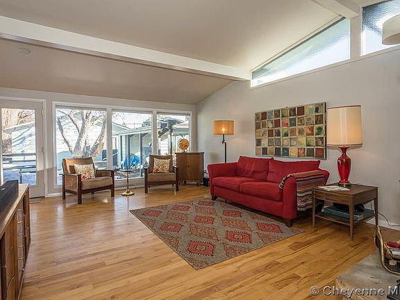 Updates throughout this mid-century modern ranch style home. Newly painted sunroom, original oak flooring with updated maple flooring in the living area. Awesome brick, wood burning fireplace, wood beams and double pane windows allowing sunlight to radiate throughout this lovely home. Remodeled master and main floor bathrooms featuring double sink vanities, new floors, and comfort height toilets. Newly painted deck which looks out to the beautiful fenced backyard, you must see to believe.