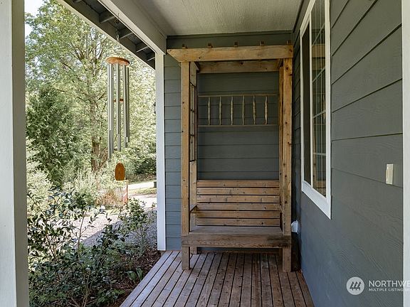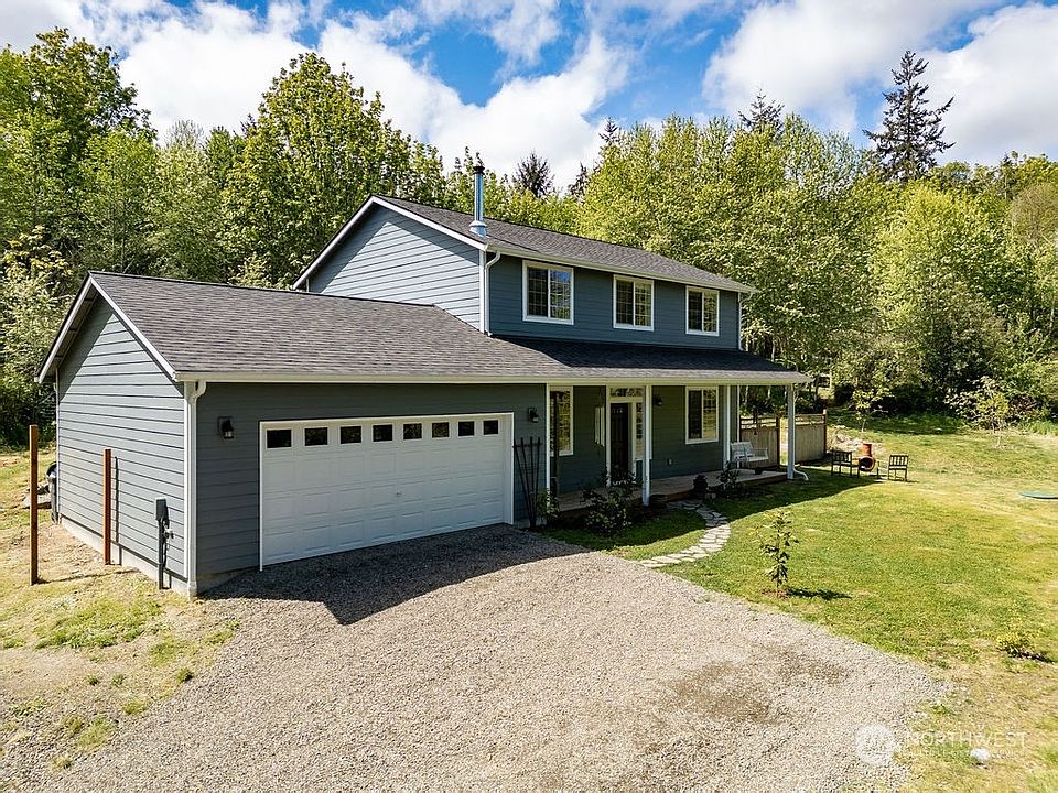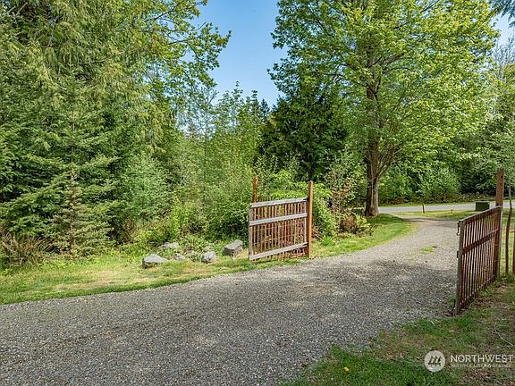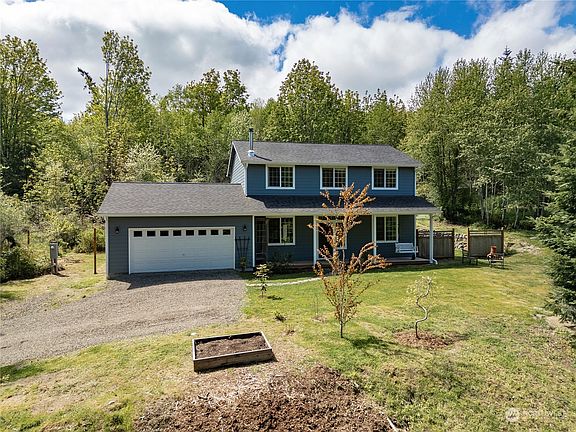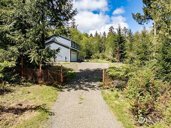 Built in 2020 this lovely newer home is nestled in the forest on nearly 5 acres of perfect & natural northwest landscape. Sun kissed covered porches front and back, rock terraces, garden space, trails... paradise. Main floor is well laid out with quartz/stainless kitchen, dining space, living room and extra room off kitchen perfect for music, office, studio or den. Three bedrooms up including a nice primary en suite with good sized walk in closet and bath. Two additional guest rooms have shared bath at end of hall. Spacious garage for cars, storage, hobbies, shop? Feels very private but just a few minutes to groceries, parks, boat launch, restaurants. Come check it all out!
