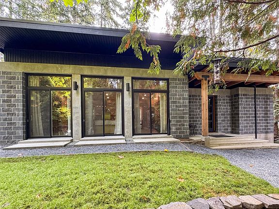 Fully engineered and masonry-built, the home is designed for durability and efficiency with a metal roof, vaulted ceilings, wood beams,solid masonary with 16" thick walls and in-floor heated concrete throughout.Step through the edge-grain fir door into this custom designed 2-bed/2-bath Modern home where comfort meets low-maintenance living.A heat pump and a custom fireplace keep things comfortable year-round.The open-concept living area flows outdoors through multiple patio doors.The cook’s kitchen features custom birch cabinetry,poured-concrete counters, a propane range, and a walk-in pantry.The split-bedroom layout provides privacy:the primary suite opens to the deck and includes a walk-in closet and spa-like ensuite with soaker tub and heated towel rack; the second bedroom enjoys its own covered deck.Water is from a private well with a filtration system.A 450 sq.ft. detached garage is ready to finish—great workshop/studio potential.Enjoy efficient island living in this modern home!
