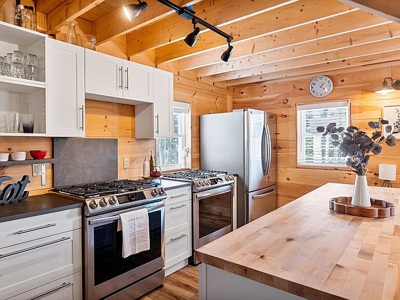 Surrounded by nature yet close to town, you’ll love this cozy secluded escape in the NEK! Looking for an oasis away from the city, yet close to all the Northern Ski resorts & mountains to explore? Look no further than this Hardwick home, built in 2019! Step inside to an open first level, with natural wood giving the feel of a cabin. The open living room features bright windows and leads directly into a true chef’s kitchen. The kitchen features two full-sized ranges, stainless steel appliances, and an extra-large island with a wood countertop and seating for four. Tucked off the kitchen is a stacking washer and dryer, hidden behind a sliding barn door. An open staircase divides the main floor, with a spacious 3/4 bath rounding out this level. Upstairs, the half story offers two bedrooms, each with natural light and more natural woodwork. Outside, enjoy your 14+ acres, adjacent to woodlands and nearby the Lamoille River but high in elevation. The acreage is divided over 2 lots: Lot 1 contains the home, and Lot 2 has a wastewater permit for 4 beds, plus a water line and power meter, giving you options to expand and build however you'd like! A long driveway that climbs in elevation offers privacy and distance from the road & river. This charming home is perfect for anyone seeking a smaller footprint or a nature-filled getaway. Less than a mile to Hardwick’s Main Street, enjoy being close to town amenities but steps from all the green space Vermont has to offer.