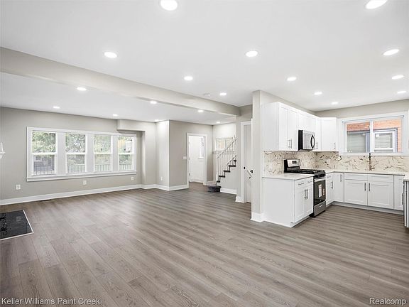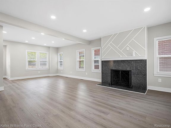Completely remodeled Tudor in Detroit’s Morningside (48224), steps from Grosse Pointe. With 2,200+ sq ft across three finished levels, this home offers 4 bedrooms, 2.1 baths, a finished basement with egress window, and a brand-new 2.5-car garage. The main level features an open living/dining area with recessed lighting, statement fireplace wall, and LVP flooring flowing into a crisp white kitchen with stone-look surfaces and stainless appliances. Upstairs you’ll find well-sized bedrooms and an updated full bath. The third level is a true primary suite—bedroom with private bath and walk-in closet. Finished lower level adds versatile rec space plus laundry and storage. Refreshed exterior, fenced yard, and wide drive. Convenient to Mack Ave amenities, parks, and commuter routes. Turn-key Detroit Tudor with space, updates, and location.