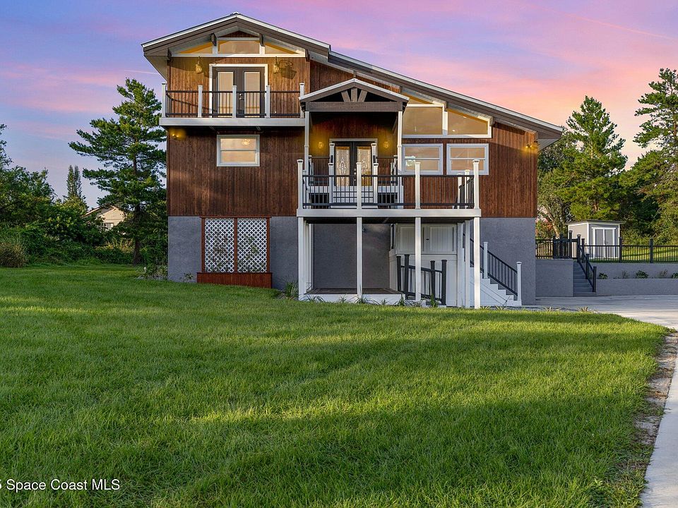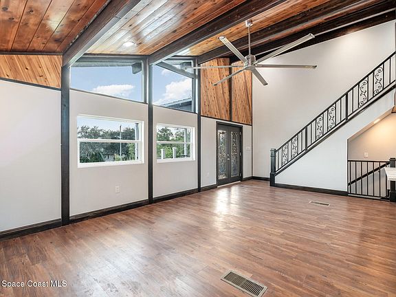 This stunning post-and-beam pool home blends rustic charm with modern living on nearly an acre of land. Gorgeous vaulted cedar ceilings with rich dark beams bring warmth and character throughout. The gourmet kitchen is a showstopper- featuring a farm-style sink, 36-inch induction cooktop, 42-inch built-in refrigerator and coffee/wine bar complete with wine cooler and ice maker-perfect for entertaining! Enjoy two master suites, two additional bedrooms, and a private in-law suite in the basement, offering space and flexibility for family and guests. Relax in your screen-enclosed pool with jacuzzi, surrounded by elegant paver decking- creating your own private retreat. There's plenty parking for your boat or RV. Watch live rocket launches from nearby NASA Kennedy Space Center and enjoy beautiful beaches less than 30 min away. Major updates- roof, septic, windows, flooring, and water heater are all less than 3 years old. Lsted by an LREA.