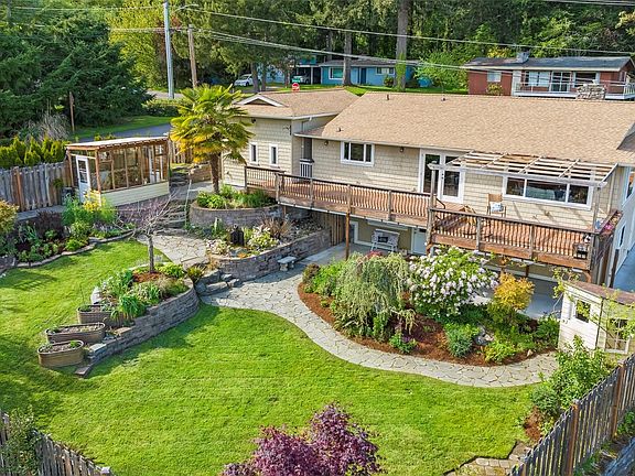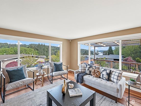 Sophisticated living with Gig Harbor views! Spend your days soaking up the harbor views on your spacious deck & enjoy the peaceful retreat of the backyard garden haven. Elevated on the North end of the harbor with fun and frolic right outside your door, this two level home could live separately. The open main floor, ready for entertaining, has exotic Moabi wood floors and high-quality cherry cabinets throughout. This 3-bedroom, 2.75-bath home offers a separate living space downstairs (2 beds up, 1 down) with oversized pantry storage & safe, ample parking including a detached garage w/workspace, PLUS a new roof and a fabulous greenhouse! It’s the perfect pairing of elegance and function, where comfort and style meet in every detail.