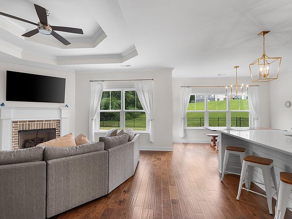 Inside, you'll find over $38,000 in thoughtful upgrades, including engineered hardwood flooring throughout and luxurious quartz countertops. The gleaming hardwoods enhance the spacious, open floor plan, while the large kitchen serves as a true centerpiece—featuring a generous island perfect for casual dining, meal prep, or entertaining guests. The kitchen seamlessly opens to the living and dining areas, creating a bright and welcoming atmosphere.