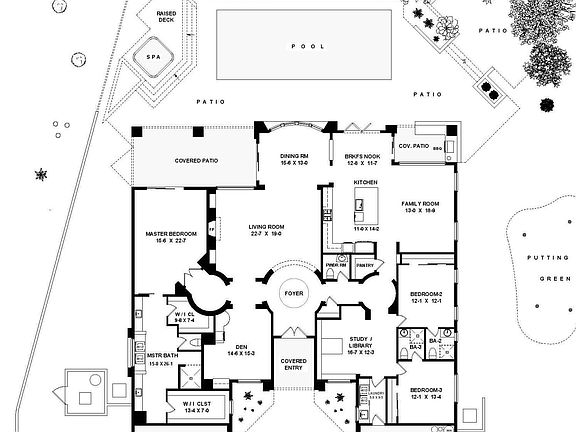 A home with so many exquisite features! Three bedrooms, 3.5 baths, den, study/library, large backyard and side yard with putting green, pool, spa and open spaces! Paved driveway to auto court and covered front entrance with an elevated frontage. Step into a lovely domed foyer with views to the living room, formal dining room and multiple windows to outdoor splendor and welcoming patio with pool. Livingroom has walled stone fireplace and hearth. Each side has designer niches. An inviting lounge area off foyer with built-in beverage bar (wine cooler and ''cask''). Shelving unit with unique display cabinet! Kitchen is stunning! Beautiful stone island with floating stone sides. Light toned cabinets accented with great backsplash. Charming sitting area at exit to patio. Click MORE Walled ovens, large built-in refrigerator, vented hood over gas range top. Open to great room. Kitchen and great room have doors to patio area and the convenient outdoor kitchen with grill, refrigeration, counter for seating. Hallway off kitchen to powder room with pedestal sink and decorator tiled wall. Double doors take you into primary bedroom and bath area. Carpeted spacious area. Doors to patio. Barndoor to primary bathroom. Split dual vanities. Wash/dryer in middle for convenience! Dressing area. Dual walk-in closets. Bedroom 2 and 3 both have own bathrooms with walk-in showers. Large den with wall of built-in shelving and drawers. Laundry room has counter space and storage space. Backyard paradise: Large pool with water features, raised area with spa and seating; another raised sitting area with matured plants in retainer wall. Two covered patio areas - one with the outdoor kitchen. Mountain views in distance and totally open and private space. Mature and manicured landscaping providing beauty, tranquility, and privacy. Gorgeous home on perfect lot with perfect design and amenities!