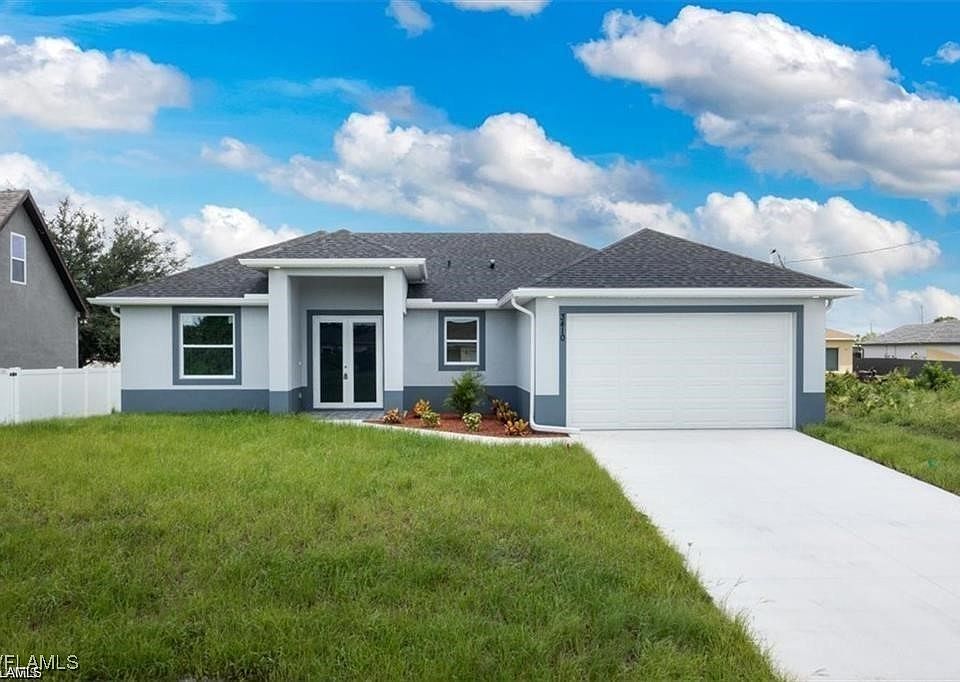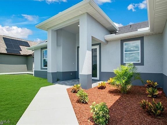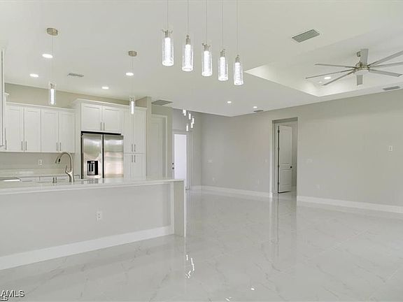 Welcome to an exceptional new construction residence in the heart of Lehigh Acres, where contemporary luxury meets thoughtful design. This impeccably crafted home presents an enticing blend of sophistication and practical living spaces, offering three bedrooms and two well-appointed bathrooms. Step through the elegant double-door entry into a home that exemplifies modern Florida living. The great room design creates an impressive sense of openness, seamlessly connecting living spaces and establishing an ideal environment for both entertaining and daily life. The heart of this home is its beautifully conceived kitchen, featuring a traditional eat-in design enhanced by a generous island that doubles as a casual dining space. Culinary enthusiasts will appreciate the complete suite of new stainless steel appliances, including a refrigerator, dishwasher, microwave, and range. The kitchen's sophisticated aesthetic is elevated by premium quartz countertops, which extend into the bathrooms, maintaining a cohesive design throughout. The primary bedroom suite stands as a private retreat, boasting a spacious walk-in closet and an elegant bathroom with dual sinks. Two additional bedrooms offer comfortable accommodations for family members or guests, while the second full bathroom ensures convenience for all. Throughout the residence, premium porcelain tile flooring creates a seamless flow, reflecting light and contributing to the home's bright, airy atmosphere. Safety and durability were paramount in the design, with impact windows and doors providing peace of mind during Florida's seasonal weather. The covered lanai extends the living space outdoors, offering a serene setting for morning coffee or evening relaxation. Professional landscaping enhances the front yard, creating immediate curb appeal and a welcoming approach to your new home. This residence's location proves equally impressive, positioned just blocks from Lee Boulevard and offering swift access to Fort Myers. The neighborhood boasts exceptional educational opportunities, with elementary, middle, and high schools mere moments away, along with a public library for lifelong learning. Daily conveniences are equally accessible, with shopping and dining options within easy reach. For the practically minded, it's worth noting that this property sits outside designated flood zones, offering additional peace of mind. The inclusion of a washer and dryer adds to the move-in ready appeal of this thoughtfully designed home. This new construction represents more than just a house; it's an opportunity to embrace a lifestyle where comfort meets convenience, where modern amenities blend seamlessly with practical living, and where every detail has been carefully considered to create an exceptional living experience. Don't let this remarkable opportunity pass you by - schedule your private showing today and step into your future home.