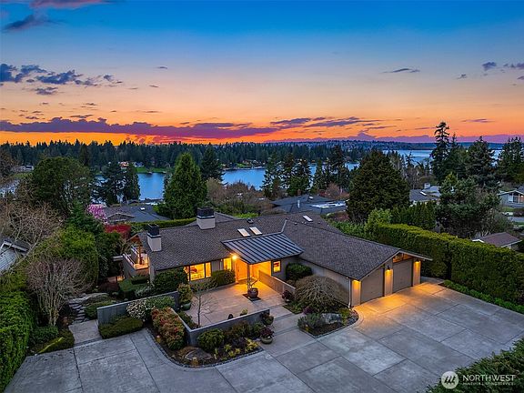 Nestled in a private setting on cherished Yarrow Point, this light-filled Northwest Contemporary boasts Lake Washington views and gorgeous sunsets from its western orientation on a spacious 15,450± sq ft lot. Relax & unwind both indoors & out with thoughtful spaces for everyday living and gathering. The expansive island kitchen + view great room w/soaring vaulted ceiling is the heart of the home. Primary + bedroom on the main with 2 additional bedrooms, office, media room and den on the lower level. Expansive outdoor living areas w/lush landscaping and a large grassy yard for play. Generous auto court makes entertaining a breeze. Just minutes to the world-class amenities of Downtown Bellevue in one of the Eastside’s favorite communities.