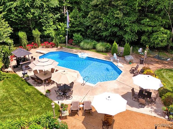 Multi-generational, water view living in Central Powhatan County, offering a picturesque setting on a 3.88 acre corner lot with views of the pool or lake from almost every angle. This home features a serene, private backyard pool oasis, meticulously maintained with expert landscaping, blooming to the brim. Inside, the home boasts a two-story living room with built-ins, and an abundance of natural light throughout with central vac as well as an added convenience. The open-concept living and kitchen areas, formal dining room, and formal sitting room offer a perfect blend of elegance and comfort. Kitchen is upgraded by center island with sink and seating area, an appliance pantry with receptacles, walk-in pantry & eat-in area. Two spacious first floor primary suites occupy each wing of the house. Each primary suite offers their own upgraded touches whether that be the fireplace, jetted tub, built-in vanity, or walk-in closet! Two more bedrooms await upstairs, each with large walk-in attic storage. A first floor office and bonus room above the garage creates additional opportunities for living space. Ample space to entertain both indoors and outdoors! Host countless guests in the fenced-in yard & pool space. The back deck is structurally sound for a hot tub, and the front porch provides a perfect spot to sit back and savor the sounds of the country. The shed conveys with the home as well and offers 14x30 ft of storage. Enjoy views of the 50 acre lake from the comfort of your own home. Massive unfinished basement (1,674 sqft) with the potential for tall ceilings if finished.