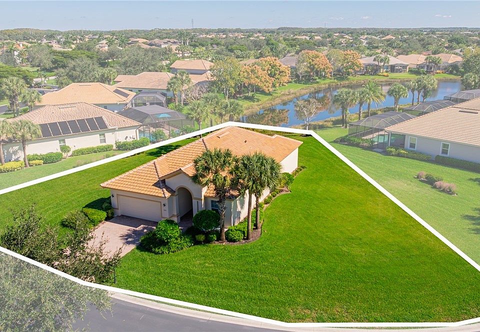 By Far, the largest Building lot in Lakeview at Verandah with approximately .4 Acres! This 3 BR, 2 BA Home combines the serenity of a lush tropical setting with the breathtaking beauty of a sparkling lake view—perfectly framed by your expansive screened lanai. Enjoy your morning coffee or evening cocktail, you've got Front Row Seats for watching the vibrant display of large birds along your long lake view. This home is a short walk to The Beloved Verandah Dog Park!