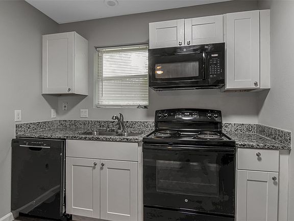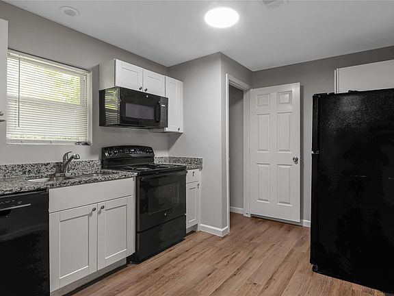 Neutral paintVinyl plank flooringGranite counter topsNice lightingDramatic black appliancesNice closet spaceOpen concept kitchen