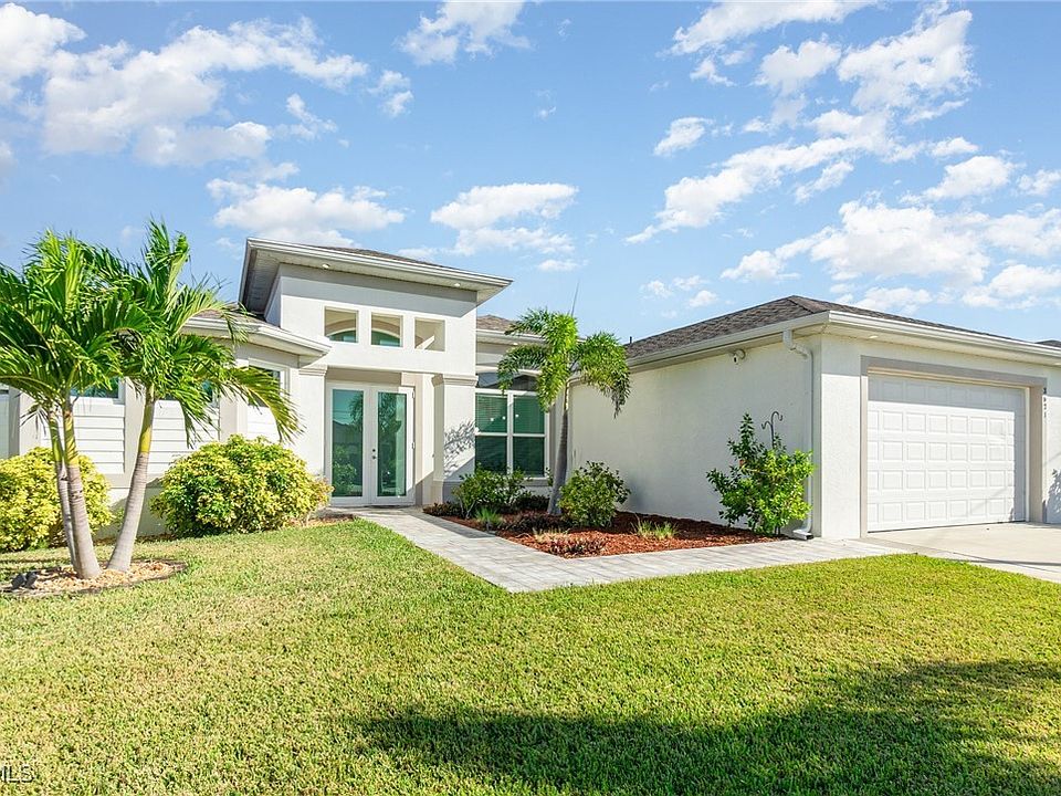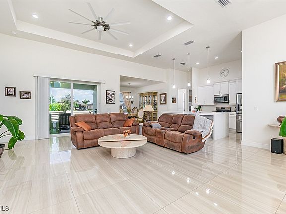 Top Location in NW Cape Coral. Stylish 3-bed, 2-bath home with nearly 2,000 sq ft, impact-rated windows & doors, and gorgeous 30" porcelain tile throughout. The open-concept kitchen features a quartz waterfall island, 42" soft-close cabinets, and stainless appliances. The owner’s suite impresses with a tray ceiling, dual walk-in closets, and a spa-style bath with a soaking tub and oversized walk-through shower. The guest bath includes direct access to a future pool area — thoughtfully prepped with a dedicated pool door. Enjoy an extended paver patio and custom privacy fence in your oversized backyard. Extras: epoxy garage floor, 8’ doors, and upgraded tile work throughout — this home stands out in one of Cape Coral’s most desirable neighborhoods. Extras: High-end Fence around the home, extended terrace, ready to add a pool. (37k)